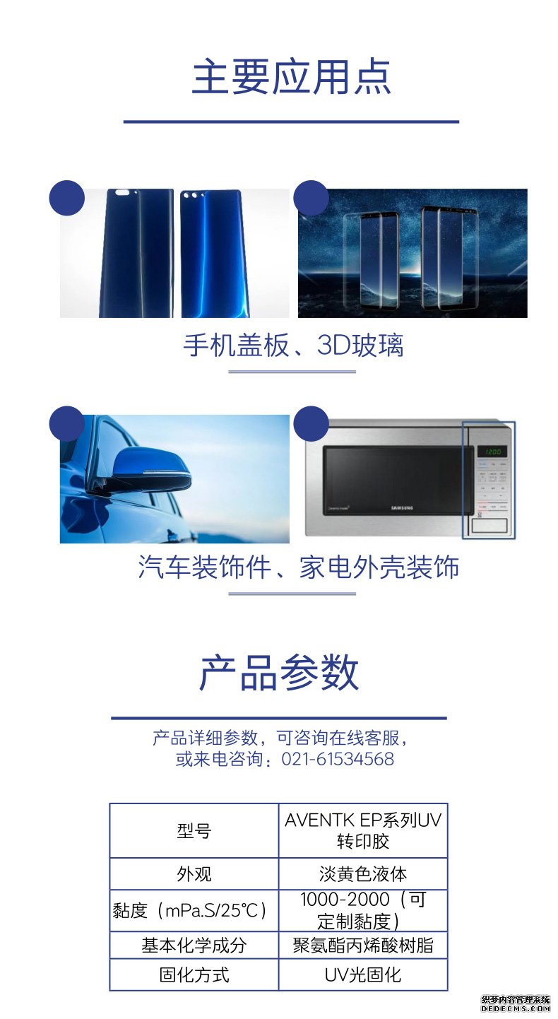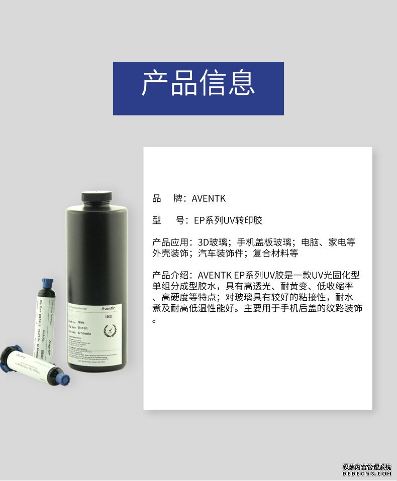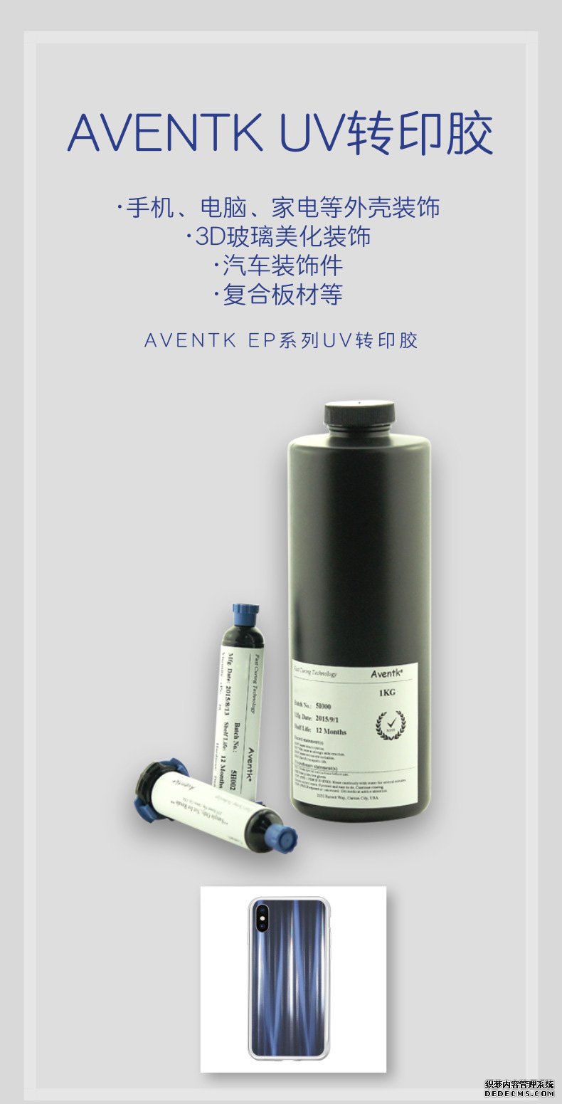 AVENTK 2007系列UV膠是一款UV光固化型 單組分成型膠水,具有高透光、耐黃變、低收縮率 、高硬度等特點(diǎn);對玻璃具有較好的粘接性,耐水 煮及耐高低溫性能好。主要用于手機后蓋的紋路裝飾。