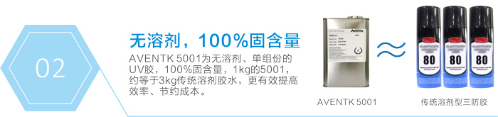 Aventk 5001 是用于電路板保護的、可以UV和濕氣雙重固化的保形涂層,又稱(chēng)三防漆(防潮、防鹽霧、防霉)。