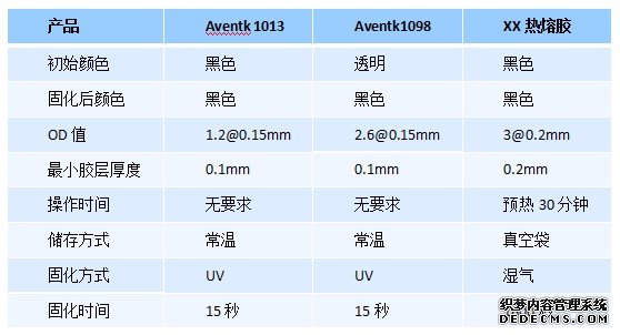 針對以上問(wèn)題,AVENTK還研發(fā)了一款變色UV膠,能夠良好解決以上不足。變色UV膠在膠水固化后變色之前,就是普通的UV膠,具備UV較的固化速度快的優(yōu)勢,不存在光線(xiàn)遮擋導致的固化不完全的問(wèn)題,較熱熔膠方案固化速度快非常多;膠水固化后變成黑色,解決了傳統UV膠遮光導致固化不足的問(wèn)題,遮光效果也可以同熱熔膠媲美。各項對比如下:
