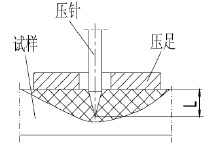 具有一定形狀的鋼制壓足,在試驗力作用下垂直壓入試樣表面,當壓足表面與試樣表面完全貼合時(shí),壓針尖端面相對壓足平面有一定的伸出長(cháng)度L(見(jiàn)下圖),以L(fǎng)值的大小來(lái)表征邵氏硬度的大小,L值越大,表示邵爾硬度越低,反之越高。