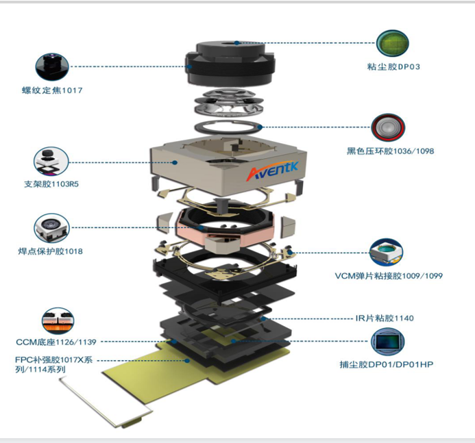 1. 手機攝像頭用膠:一直以來(lái),攝像模組UV膠都是AVENTK的重點(diǎn)產(chǎn)品,也已成功進(jìn)入國內一二線(xiàn)攝像模組制造廠(chǎng),AVENTK攝像模組UV膠在國內膠粘劑行業(yè)都有著(zhù)一定知名度。目前AVENTK手機攝像頭用膠點(diǎn)覆蓋螺紋定焦、支架膠、焊點(diǎn)保護膠、CCM底座、FPC補強膠、粘塵膠、捕塵膠、黑色壓環(huán)膠、VCM彈片粘接膠、IR片粘接等。