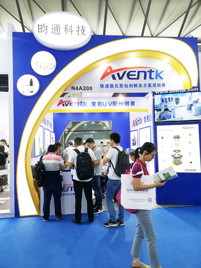 在此次展會(huì )中,昀通科技(AVENTK)主要展品為UV變色膠、PCBA  UV膠、攝像模組UV膠、窄邊框黑色UV膠及UVLED固化設備,吸引了眾多客戶(hù)前來(lái)咨詢(xún)交流。