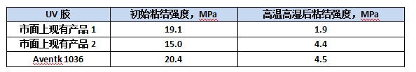 Aventk 1040V3與市面上現有2款UV膠經(jīng)過(guò)85℃、85%濕度條件下168小時(shí)后的粘結強度對比: