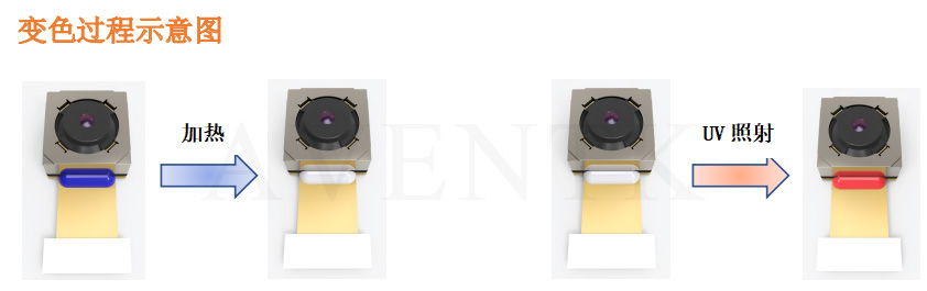 AVENTK 1017X31C系列用于攝像模組FPC軟板補強的UV變色膠在UV固化后,再加熱進(jìn)行變色,膠水不僅滿(mǎn)足FPC補強粘接要求,還能做到固化前后的顏色和底色有可肉眼識別的差異,以及UV膠水固化前后的顏色可肉眼區別。