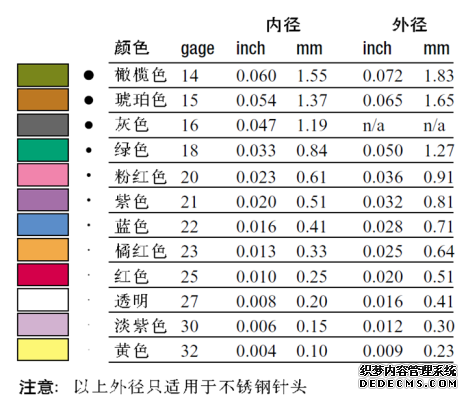 圖3是針頭的顏色與內外徑尺寸,在實(shí)際的點(diǎn)膠操作過(guò)程中,我們一般建議:針頭尺寸(內徑)選擇為點(diǎn)膠寬度的一半左右,然后通過(guò)氣壓和點(diǎn)膠時(shí)間做細節調整。